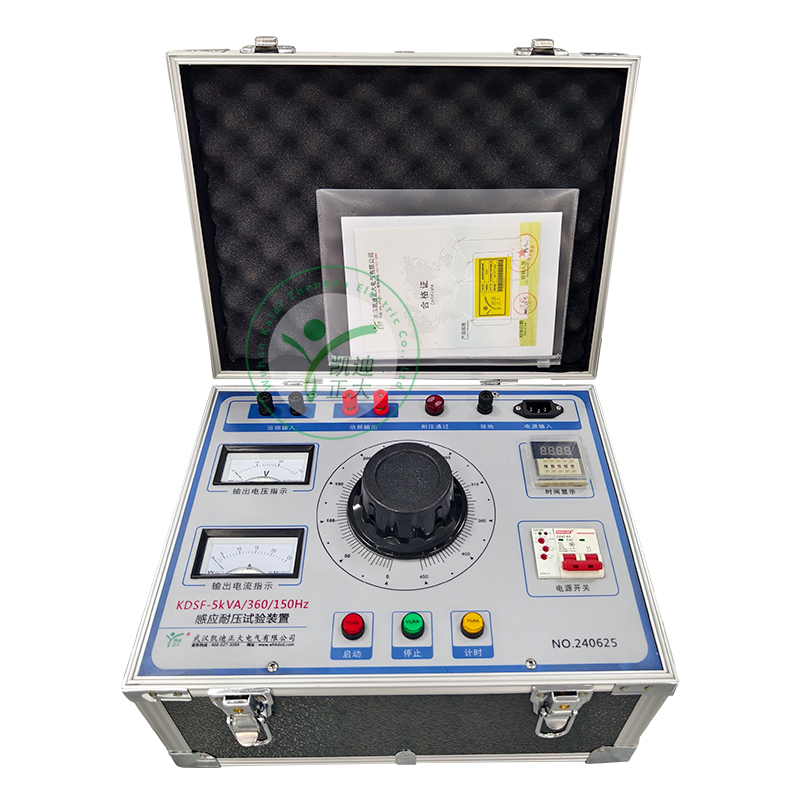 KDSF 感應耐壓試驗裝置是利用磁路的飽和特性,取出諧波中分量最大的三次諧波電壓,作為發生器的電源,對感應線圈式的電氣產品作匝間、段間、層間的倍頻、倍壓試驗;以考核線圈的絕緣強度、耐壓水平。