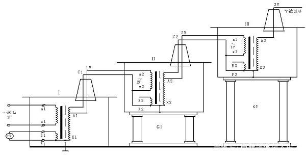 串級(jí)試驗(yàn)變壓器的接線如下圖: