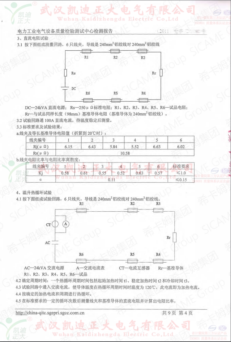 法國希卡姆集團全資注冊的希瑪電力設備公司,2011年6月在武高所電力工業電氣設備質量檢驗測試中心檢定H型線夾。檢測結論:根據DL/T765.1-2001對希瑪電力設備送檢的HC650型H形線夾進行了尺寸和外觀檢查,結構和組裝檢查,直流電阻試驗、溫升試驗、熱循環試驗、短路電流試驗和握力試驗,檢測項目合格。