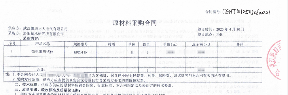 近日,洛陽軸承研究所有限公司經(jīng)過嚴(yán)格篩選與深入考察,最終決定采購信賴武漢凱迪正大,采購了KD2511N微電阻測試儀。此次合作不僅彰顯了客戶對(duì)武漢凱迪正大品牌的深度信賴,也驗(yàn)證了KD2511N微電阻測試儀在市場上的表現(xiàn)與廣泛認(rèn)可。