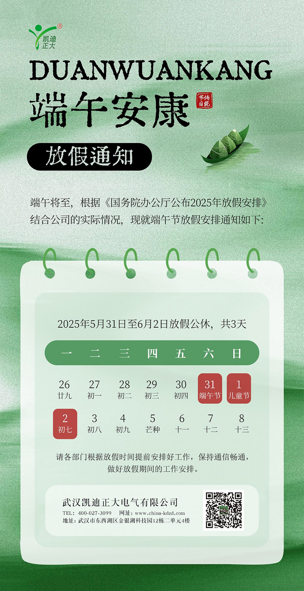 武漢凱迪正大2025年端午節(jié)放假安排的通知