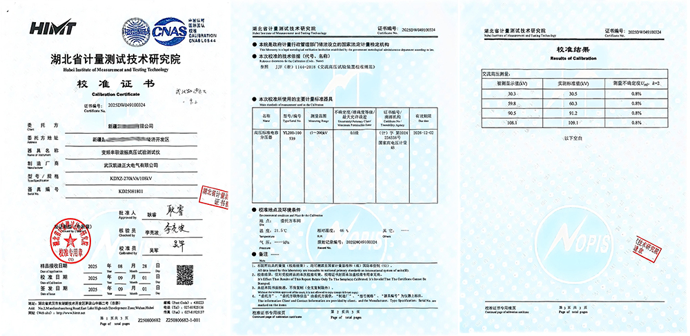 近期,新疆某能源公司采購了由武漢凱迪正大電氣有限公司生產(chǎn)的KDXZ-270kVA/108kV變頻串聯(lián)諧振試驗裝置。該設備經(jīng)湖北省計量測試技術研究院(省計量院)校準并頒發(fā)證書(證書編號:2025DW049100324),此次校準不僅標志著該設備各項性能指標符合行業(yè)規(guī)范要求,更凸顯了武漢凱迪正大在高壓電氣檢測設備領域的技術實力。
